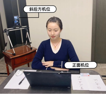 考生需要双机位模式参加复试,即需要两部带摄像头的设备,手机或电脑均可。一台设备(正面机位)从正面拍摄;另一台设备(斜后方机位)从考生侧后方拍摄。斜后方设备需覆盖正面机位屏幕并关闭麦克风和音频,以避免回声。考生应尽可能使用耳麦,以保证通话效果。