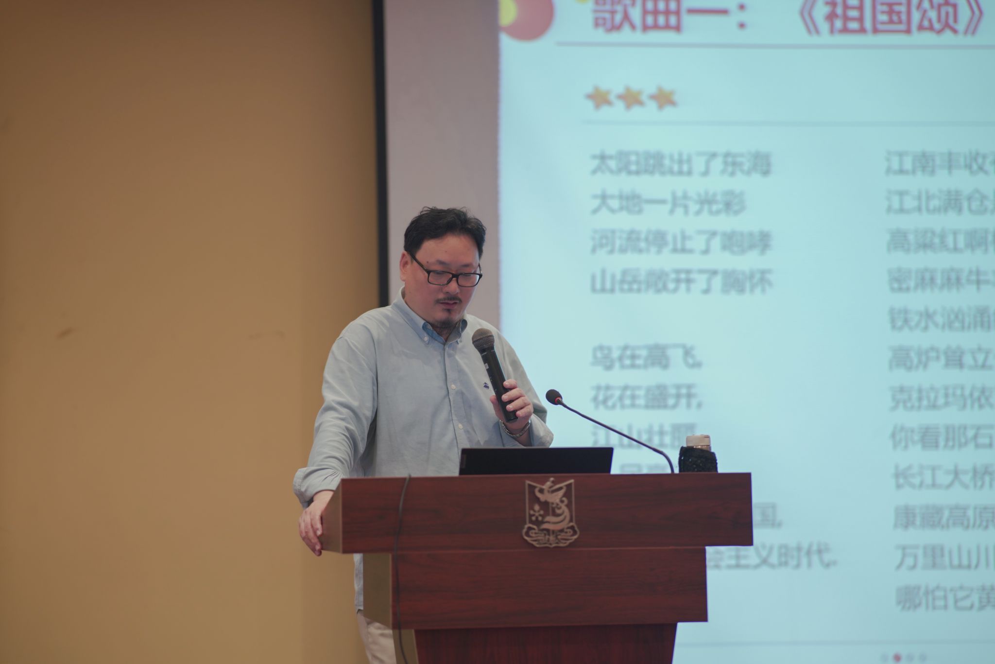 课堂上,冯老师用10多首经典歌曲从“对祖国的魂牵梦萦”、“对山河的深切热爱”和“对故土的赞美情怀”三个方面展开讲解。