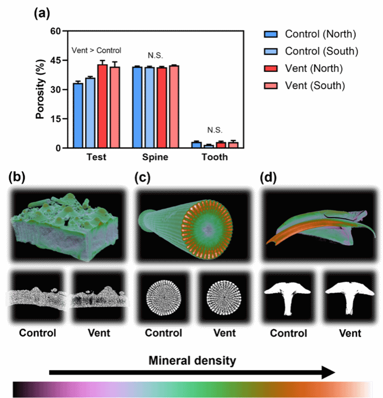 为此,汕头大学海洋生态与环境平台梁裕升教授聚焦探索海洋酸化对海胆钙化结构及功能的影响,对生活在天然二氧化碳喷口区的一种海胆的外壳、牙齿和棘刺的形态特征、机械性能和化学成分进行了系统分析,以评估海胆在酸化环境中能否产生形态适应性变化。研究发现,尽管海胆各类钙化结构在酸化环境中尺寸有所缩小,但其机械性能仍得以维持。这表明海胆或可通过形态调整,在维持防御功能的同时,将更多能量分配至生长和繁殖,从而提升其在酸化海洋中的整体适应能力。