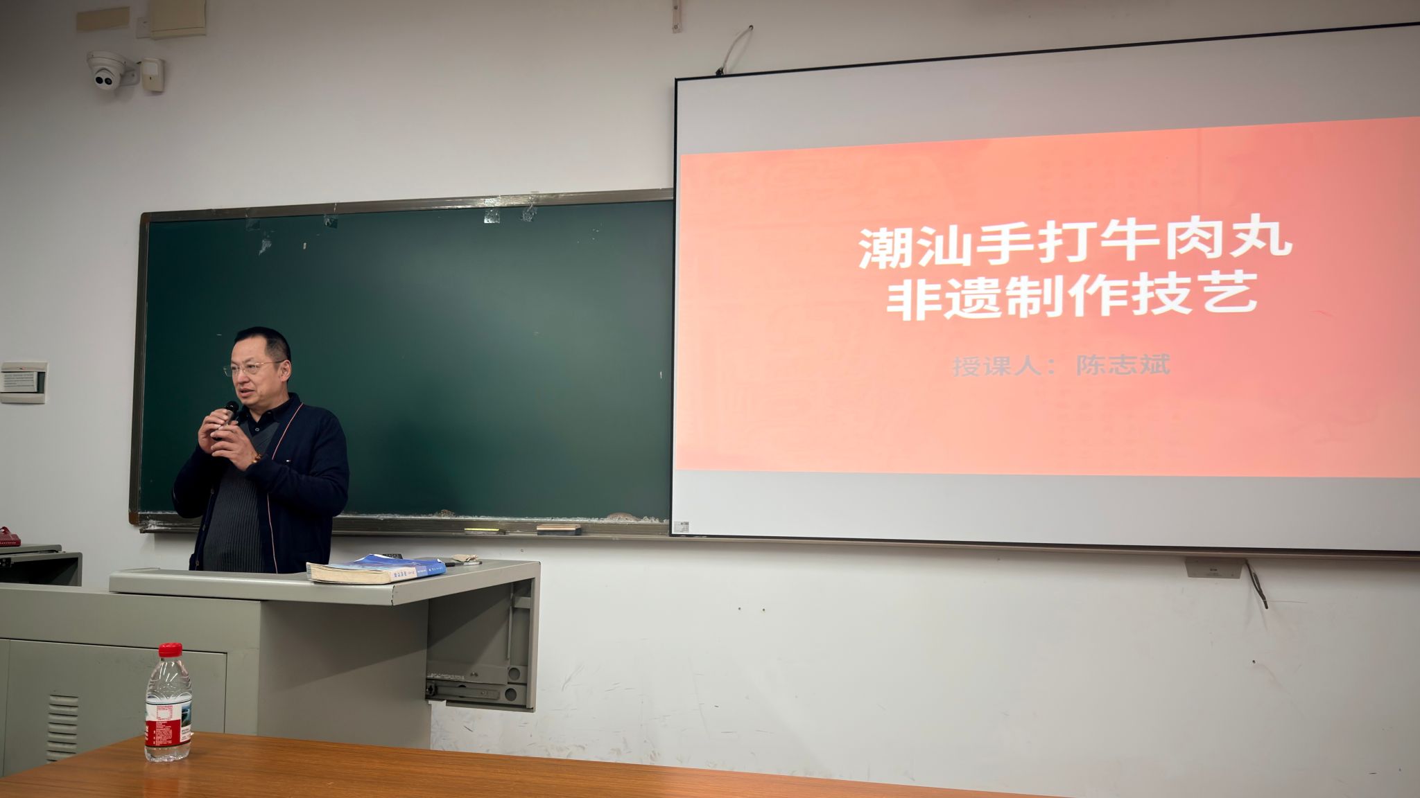 陈志斌董事长作为非物质文化遗产项目汕头牛肉丸制作技艺的代表性传承人,参与制定《广东省食品安全地方标准 汕头牛肉丸》(DBS44/005-2016)等系列省级行业团体标准,带领潮庭食品获得广东省重点农业龙头企业、广东省专精特新中小企业、广东老字号、高新技术企业等荣誉称号,旗下牛肉丸、墨鱼丸、鱼丸入选“粤字号”农业品牌目录。在课堂上,陈志斌董事长以“潮汕手打牛肉丸非遗制作技艺”为主题,从“追本溯源、匠心独运、薪火相传”三个层面,系统向学生们介绍了什么是潮汕手打牛肉丸非遗技艺、为什么要传承非遗技艺、如何传承潮汕手打牛肉丸技艺,以及这些技艺背后所蕴含的食品化学原理,帮助学生们了解行业前沿发展,让学生们感受到在传承传统工艺的基础上,通过不断的技术创新和工艺改进,特别是探索非遗技艺与现代智能制造的创新融合,让传统工艺焕发出时代光彩。