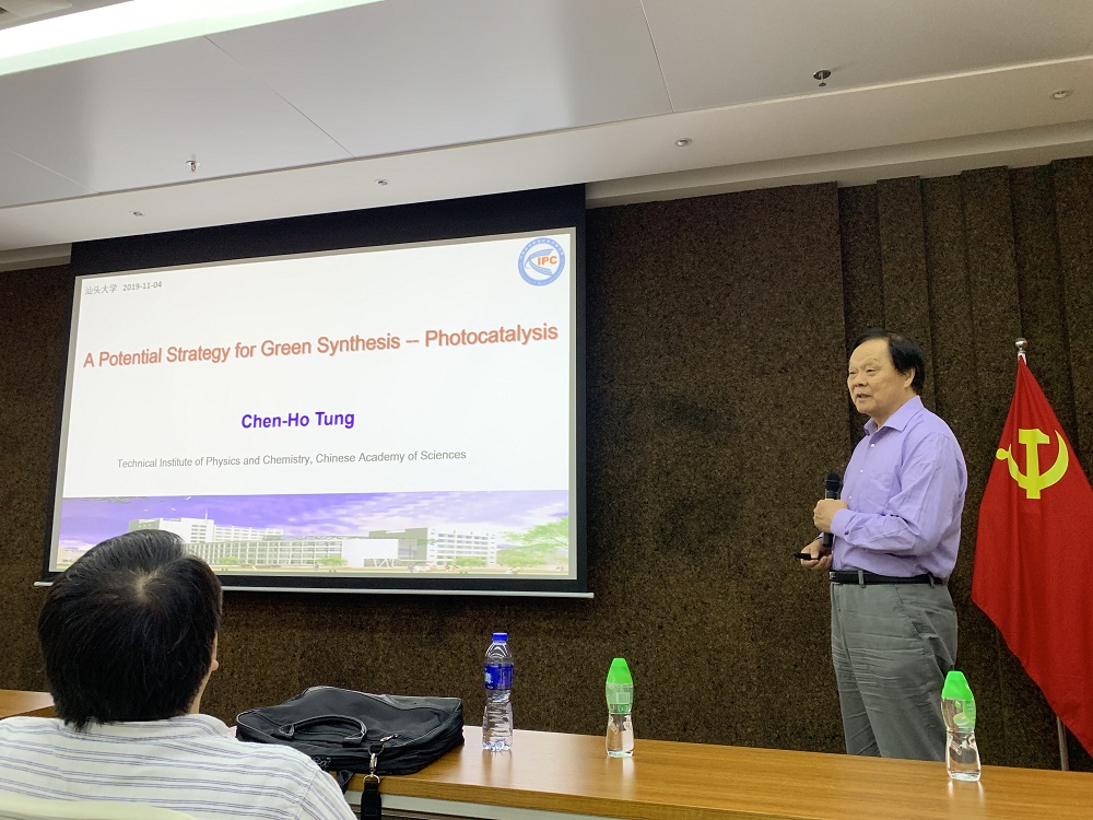 11月4日上午,佟振合院士在行政楼E401会议室为全校师生做了题为《Photocatalytic Activation of Inert Bonds and Their Functionalization via Hydrogen-Evolution Cross-Couplings》的学术报告。报告系统讲述了绿色化学对于当今社会发展的重要意义,重点阐述了光化学作为一种节能、洁净、原子经济的合成方式在基础研究以及工业生产中的重要作用。报告结束后,由汕头大学副校长刘文华教授主持,佟振合院士与化学系教师进行了座谈交流。理学院化学系主任鲁福身教授首先介绍了化学系的基本情况,随后化学系与会教师分别介绍了自身背景和研究方向。刘文华副校长对佟振合院士一行来访表示欢迎和感谢,希望各位专家能对汕大化学学科的发展打开思路、拓展方向。会上双方对合作申报省实验室项目积极献言献策,为建立合作关系打下了良好基础。