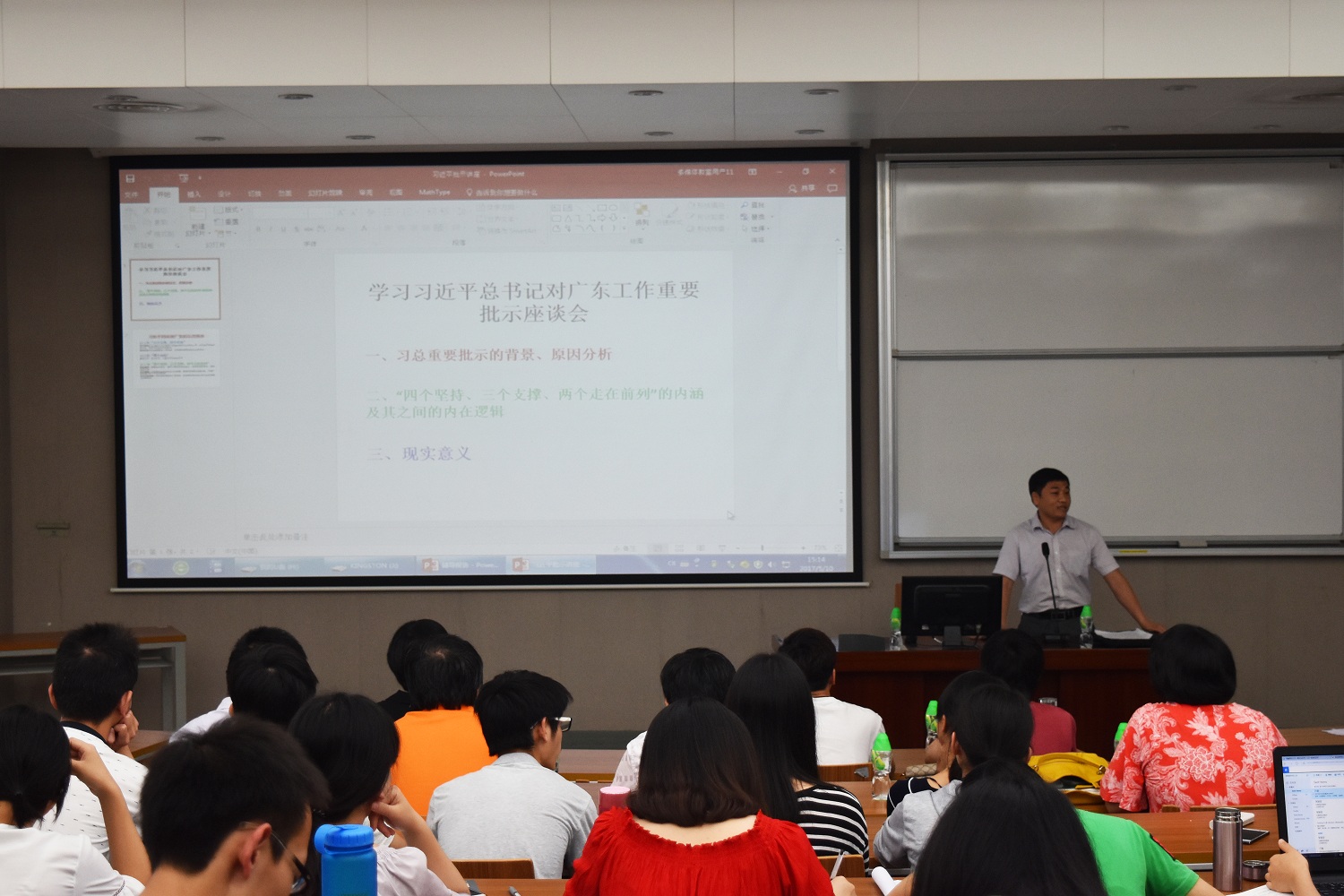 本次讲座,罗诗钿从习近平总书记三次重要批示的背景、原因分析、“四个坚持、三个支撑、两个走在前列”的内涵及其内在逻辑和重要批示的现实意义等方面,并结合实际分析,解读习近平总书记对广东工作重要批示精神,指导在座老师和同学准确把握习近平总书记对广东工作重要批示精神的重大意义和深刻要求。讲座期间,大家结合屏幕内容与讲解认真聆听,部分老师和同学携带笔记本仔细做笔记。