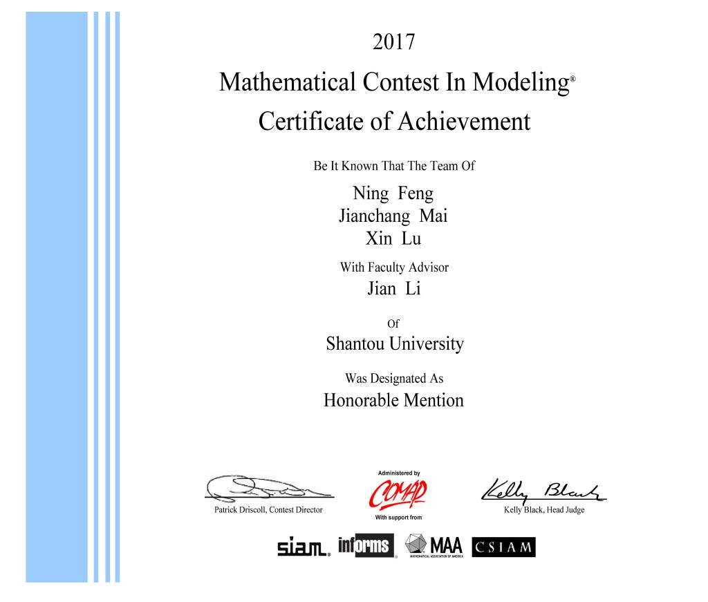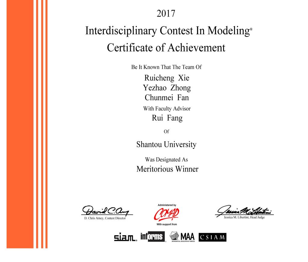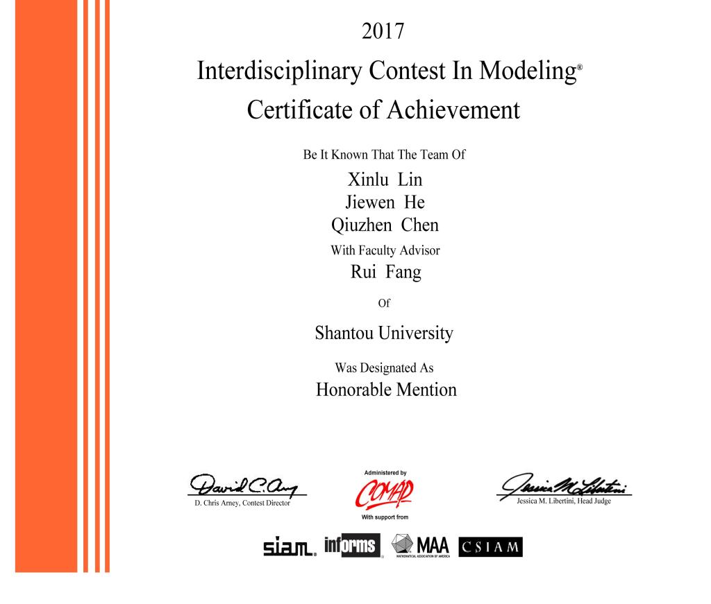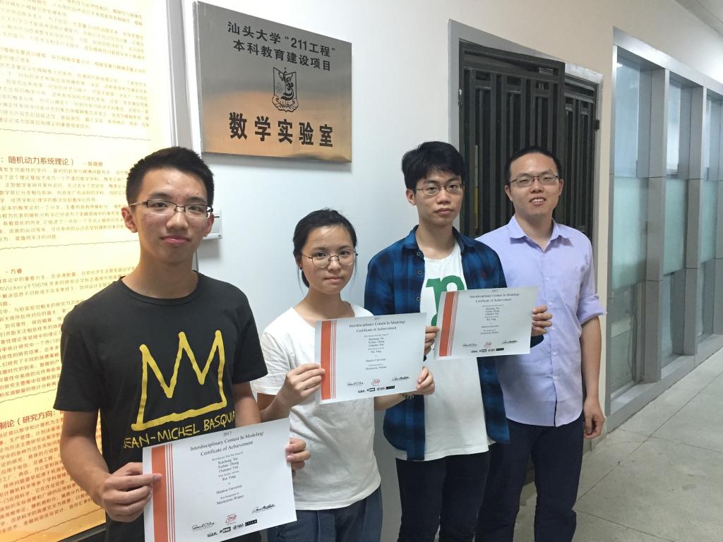 近日,2017年美国大学生数学建模竞赛成绩揭晓,汕头大学理学院数学系学生取得优异成绩。由谢睿诚、钟晔钊、范春梅3位同学组成的代表队获得一等奖(Meritorious Winner),陈慧斌、刘曼昱、李可圣、林昕璐、何洁汶、陈秋镇、宋培、何梓瑜、张权鑫、冯柠、麦健嫦、卢鑫等12位同学组成的4个代表队获得二等奖(Honorable Mention),另外还有4个代表队获得成功参赛奖(Successful Participant)。