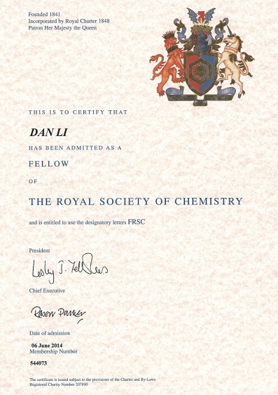 日前,英国皇家化学学会通知:我校李丹教授被入选为英国皇家化学学会会士(Fellow of the Royal Society of Chemistry, FRSC)。