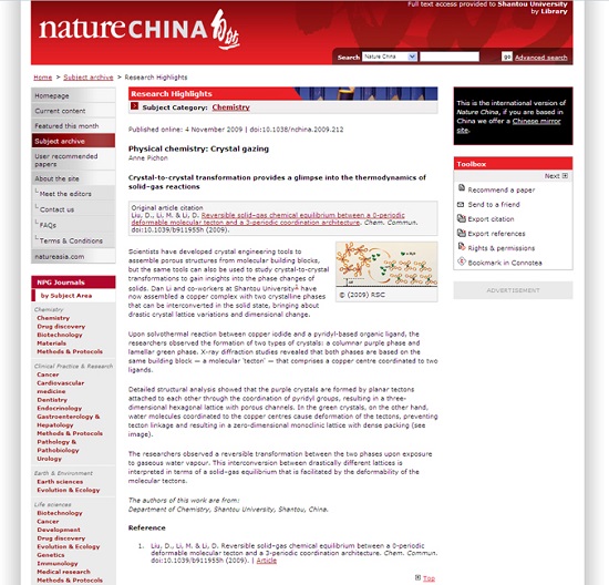该工作由研究团队在我校独立完成,积累了超过10年的成果,共在SCI收录刊物上发表论文88篇,其中SCI影响因子3.0以上论文45篇。成果获得国内外专家广泛引用和好评,被多篇国际权威综述期刊评论引用,并被化学、物理和材料科学三大学科权威刊物和其他SCI刊物他人引用累计2044次,CSCD他引95次,总他引2139次;10篇代表性论文累计他引644次,其中2篇论文SCI他引超过100次,1篇入选ESI高被引用论文,1篇被Nature China(《自然中国》)选为突出科学研究成果,1篇被选为封面研究成果。