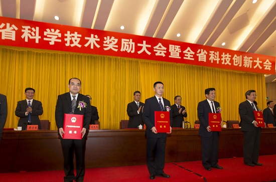4月29日下午,广东省委、省政府在广州召开广东省科学技术奖励大会暨全省科技创新大会。省委、省政府领导胡春华、朱小丹、马兴瑞、徐少华、周天鸿、梁伟发出席会议并为“2013年度广东省科学技术奖”获奖代表颁奖。
