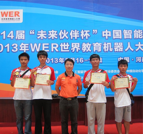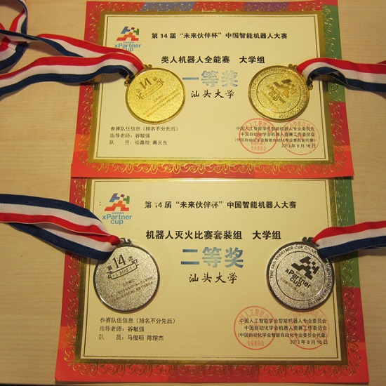 8月17日至18日,由世界教育机器人协会、中国人工智能学会智能机器人专业委员会和中国自动化学会机器人竞赛工作委员会联合主办的第十四届“未来伙伴杯”中国智能机器人大赛暨2013年WER世界教育机器人大赛国际邀请赛在洛阳师范学院体育馆举行。汕大理学院数学系由张嘉勋、黄元东、马俊明、陈榕杰4位同学组成的比赛队在谷敏强老师的带领下,参加了类人机器人全能和机器人灭火两个项目的比赛。经过两天激烈的角逐,最终张嘉勋、黄元东荣获类人机器人全能赛一等奖,马俊明、陈榕杰荣获机器人灭火比赛二等奖。这是汕大学子继去年获得该项目一等奖后的再次捧杯。