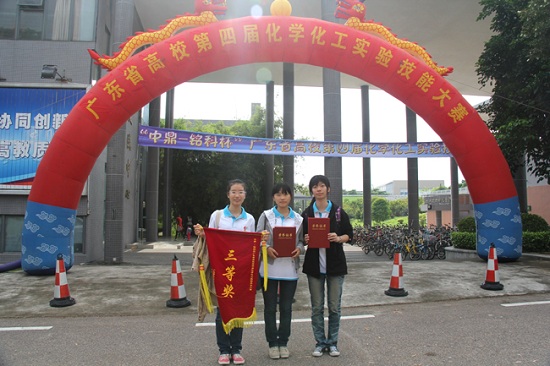 11月9日至11日,广东省高校第四届化学化工实验技能大赛在东莞理工学院举行。我校理学院应用化学专业10级学生皮云红、李慧华、李罕阳组成的代表队在化学系老师的指导下取得了优异的成绩。其中,皮云红获得本届实验技能大赛一等奖,共有10名参赛学生获此殊荣;李慧华、李罕阳分别获得二、三等奖;代表队也获得团体三等奖。