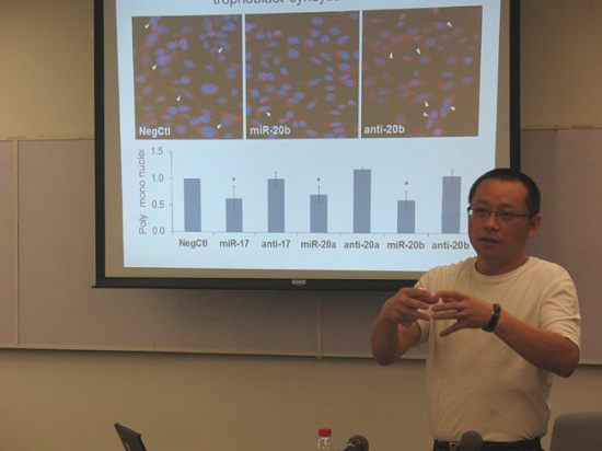 11月1日,美国加州大学欧文分校陈东宝博士假座理学院“科学沙龙”为师生作了题为“microRNA与胎盘发育”的学术报告。陈博士以其近年来在胎盘发育的研究内容,用生动的语言深入浅出地为大家讲述了microRNA调控在胎盘发育过程中的作用和机制,并与学院师生进行了交流。理学院杨增明、章跃陵、郑怀平、李升康等老师出席了讲座。