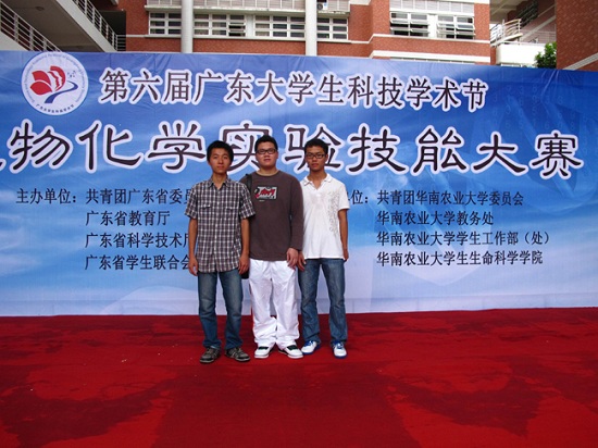 第六届广东大学生科技学术节生物化学实验技能大赛决赛于5月27日在华南农业大学举行,由汕头大学理学院生物系余杰老师指导的2010级生物技术专业陈水杏、黄晓锋和陈迪朗三位同学的参赛项目《龙须菜粗多糖的提取、测定及其营养果冻的制作》荣获大学生生物化学实验技能大赛本科组一等奖。