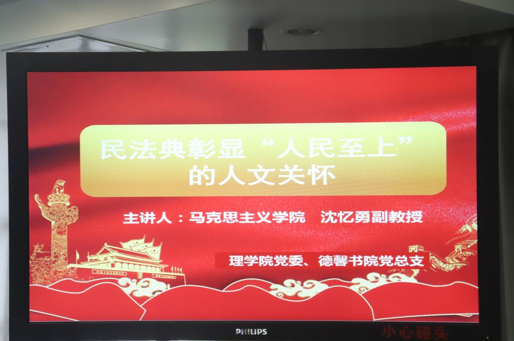 10月14日下午,理学院党委、德馨书院党总支在讲堂四组织开展了《中华人民共和国民法典》专题学习会,特别邀请了马克思主义学院沈忆勇副教授为参会人员作题为“民法典彰显‘人民至上’的人文关怀”的专题辅导,此次学习会由理学院党委书记林锦香主持,理学院教师党员、研究生党员、德馨书院全体师生党员、入党积极分子等近200人参加了此次学习会。