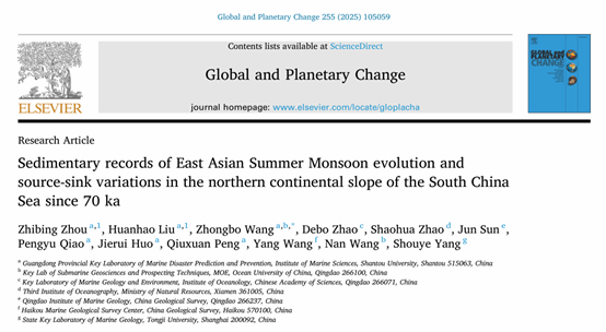 近日,理学院海洋科学专业20级本科生周芷冰同学以第一作者身份在中国科学院一区Top期刊Global and Planetary Change发表研究论文,题目为“Sedimentary records of East Asian Summer Monsoon evolution and source-sink variations in the northern continental slope of the South China Sea since 70 ka”(https://doi.org/10.1016/j.gloplacha.2025.105059)。