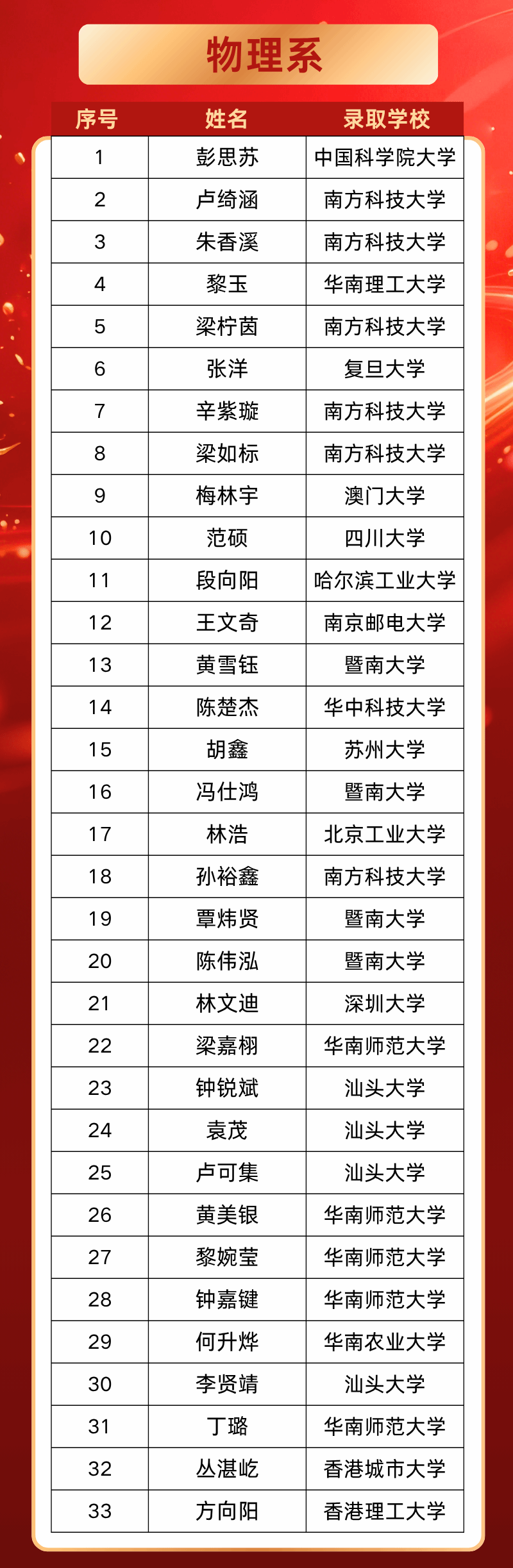 物理系112位毕业生中,共有33人升学深造,其中8人被保研到复旦大学、华南理工大学、中国科学院大学等知名高校;25人考取南京邮电大学、四川大学、暨南大学、南方科技大学等高校的研究生,升学率为29.46%。